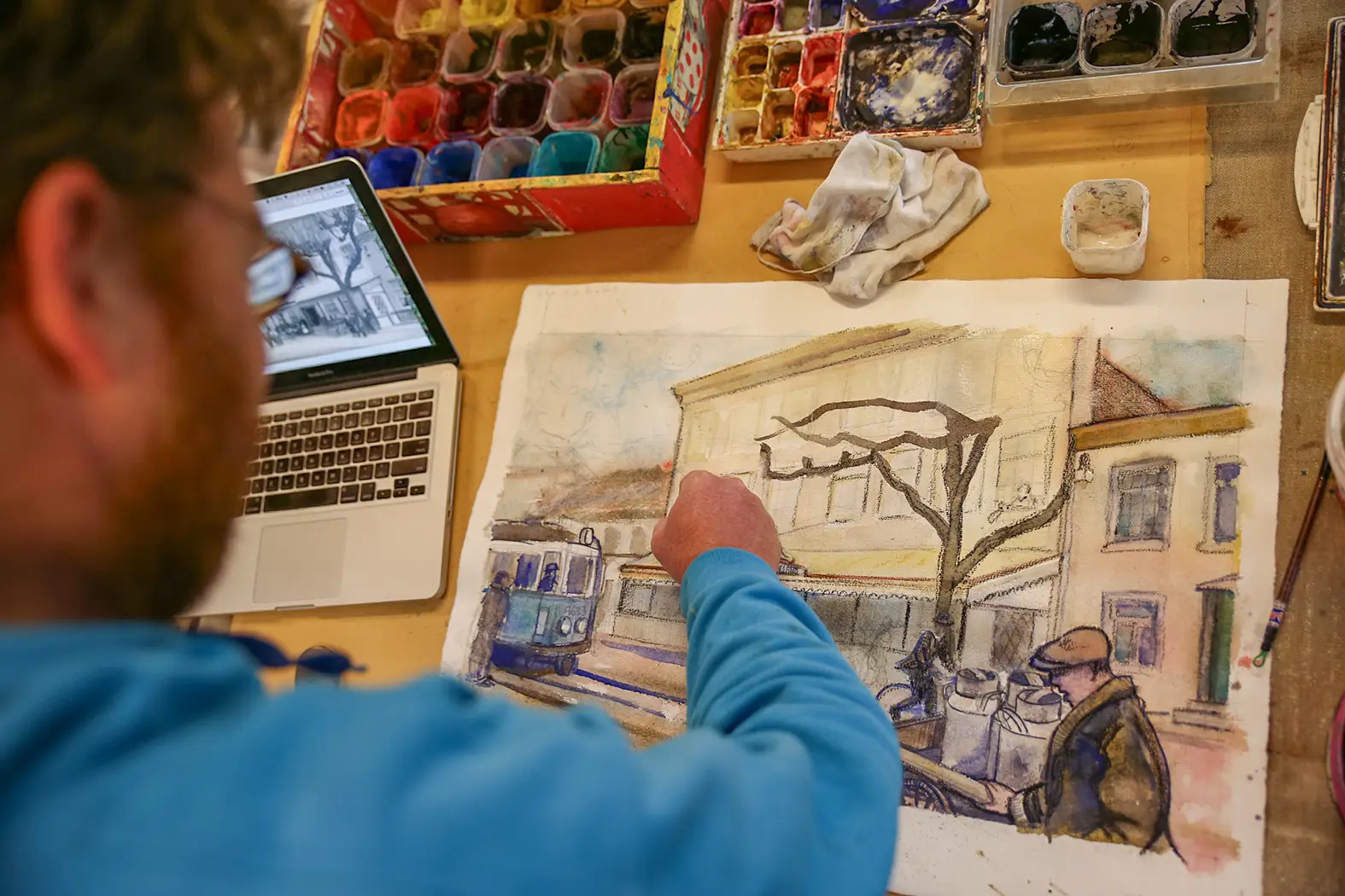 Ik ben afgestudeerd aan de KABK in Den Haag en wat ik voornamelijk doe is schilderen en grafiek maken en sinds kort ook kunstenaarsboeken. Daar hoort ook aquarelleren bij, de techniek die ik hier gebruik. Bijzonder is dat ik met schilderen mijn verf voornamelijk zelf maak met natuurlijke materialen, zoals ei, lijnolie, caseïne, bijenwas en dergelijke, ik ben dat 'green painting' gaan noemen. Ook mijn aquarelverf in het hier getoonde werk.